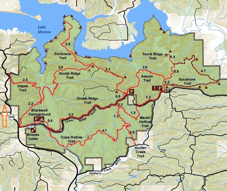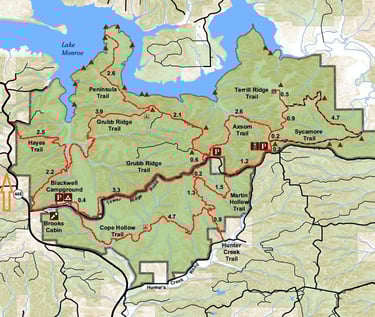 Delaney Park Loops to Spurgeon Hollow, SH to Oxley Meadow, OM to Elk Creek, EC to Leota, L to New Chapel, NC to Pixely Knob (complete-50.5 miles behind us 9.5 to go)
